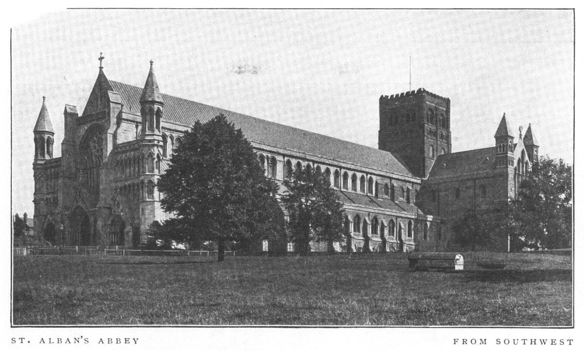 St. Albans Abbey, which was raised to the dignity of a cathedral in 1877, is one of the finest and largest churches in England. The earliest parts of the existing building date from the eleventh century; the choir was built in the thirteenth, and the Lady-Chapel in the fourteenth. The fine tower is Norman. An extensive, and not especially successful, restoration of the buildings including a new Early English west front with a large decorated window, has recently been completed.