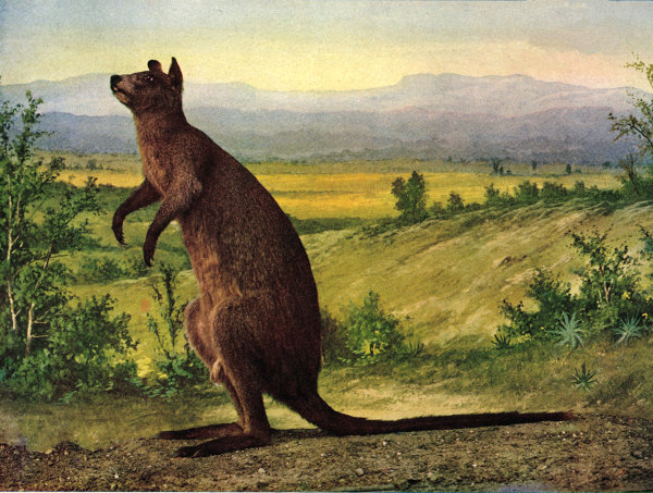 THE Kangaroos are regarded as among the most remarkable of mammals. Everything about them is extraordinary; their movements and their attitudes when at rest, the way they seek their food, their reproduction, their development, and their mental qualities. Twenty and thirty years ago, it is said, the visitor to Australia could see more Kangaroos to the square mile than there are jack rabbits to-day, and it was literally impossible to avoid the countless flocks that swarmed over the whole island. Walsh says that, with a good rifle, he could take a position on a rock and shoot all day long, until tired of the monotony of the slaughter, or until some "old man" kangaroo became desperate at his killing and decided to turn the table upon him. In those days men were paid liberally by the sheepowners to kill off the kangaroos, and it is stated that one hunter would kill several hundred a day, and one man is known to have cleared $4,500, free of living expenses, in a single year. The visitor to Australia to-day discovers a decided change in many ways, but not more so than in the comparative scarcity of this animal. He may reside on the island for a month or two and not see one kangaroo. There are still large numbers of them, but they must be hunted up and their favorite feeding-places located by guides. The sheepherders caused the creatures to be destroyed in such numbers before they became of any commercial value that they are now rarely found outside of the "bush." About three hundred miles back from the coast thousands can still be found. The country abounds in straggling bushes, with very few tall trees or woods to obstruct travel; but the bushes, while in the open country, are tall enough to make good hiding-places for the marsupials. They feed on the grass, roots, and leaves, and when startled by a hunter, leap over the bushes as easily as a rabbit jumps over the tufts of grass.