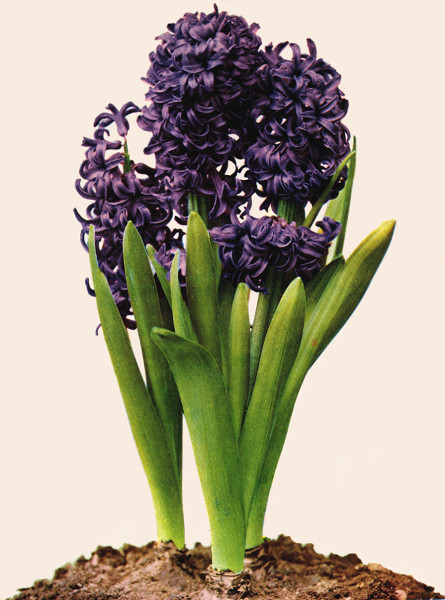 It is said that the original of the cultivated hyacinth (Hyacinthus orientalis) is by comparison an insignificant plant, bearing on a spike only a few small, narrow-lobed, wash, blue flowers. So great has been the improvement effected by the florists that the modern hyacinth would hardly be recognized as the descendant of the type above referred to, the spikes being long and dense, composed of a large number of flowers; the spikes not infrequently measure six or seven inches in length and from seven to nine inches in circumference, with the flowers closely set on from bottom to top. Of late years much improvement has been effected in the size of the individual flowers and the breadth of their recurving lobes, as well as in securing increased brilliancy and depth of color. The names of hyacinths are now almost legion, and of all colors, carmine red, dark blue, lilac-pink, bluish white, indigo-blue, silvery-pink, rose, yellow, snow-white, azure-blue. The bulbs of the hyacinths are said to be as near perfection as can be; and if set early in well-prepared soil, free from all hard substances, given plenty of room, and mulched with leaves and trash, which should be removed in the spring, they will be even more beautiful than any description can indicate. When potted for winter bloom in the house, good soil, drainage, and space must be given to them and they must be kept moist and cool, as well as in the dark while forming roots preparatory to blooming. After they are ready to bloom they do best in rooms having a southern exposure, as they will need only the warmth of the sunlight to perfect them. The hyacinth does not tolerate gas and artificial heat.