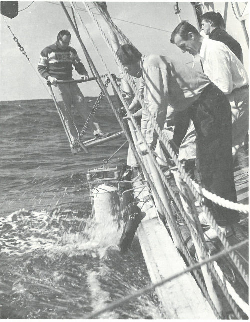 Oceanographers bringing aboard a 50-gallon seawater sampler from the ocean depths find it a difficult task, even in moderate seas. This photo was taken aboard the R. V. Crawford in the Atlantic.
