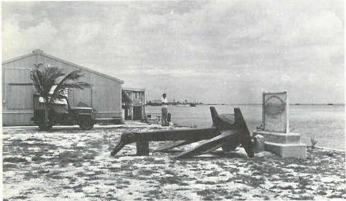 The Eniwetok Marine Biology Laboratory. Monument at right commemorates the battle for Eniwetok in World War II.
