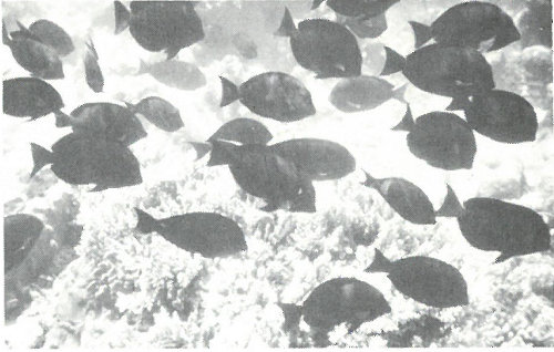 School of surgeonfish off Arji Island, Bikini Atoll, August 1964. Note coral growth on lagoon bottom.