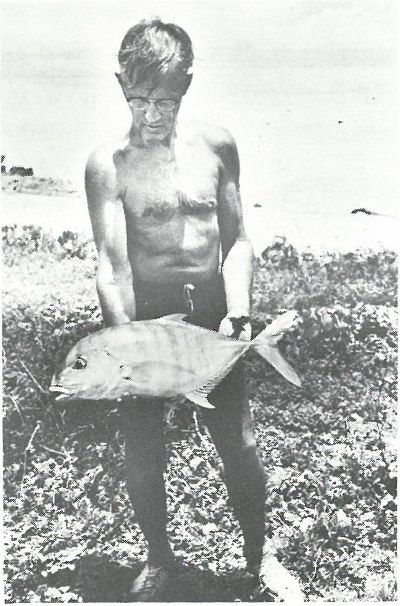 FISH. Fisheries biologist with a large jackfish caught off Engebi Island, Eniwetok Atoll.