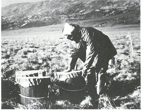 Placing equipment to measure fallout in precipitation north of the Arctic Circle in Alaska.