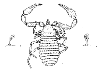 Prof. Dr. Friedrich Dahl places the external sexual organs of this family on the legs and in the Thelyphonidæ which is closely related. They are found in the second joint of the tarsus of the first legs. Careful study failed to find any trace of secondary sexual organs in Trithyreus pentapeltis.