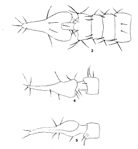 Figs. 3, 4, and 5. Various views of the caudal end of an adult T. pentapeltis. Much enlarged.