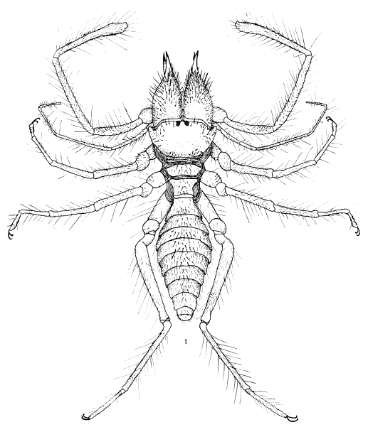 The caudal appendage of the juvenile and female is made up of three small joints tapering to a blunt end. It is held in an upright position above the abdomen. Cook in his description supposed this form to be a female or juvenile; Krayselin considers it a different species, but upon close study of the rest of the organs of this form it was finally decided that it was a juvenile and probably a female, the supposition being held that the juvenile took the form of the female, as is often the case, until the last few molts. The epigynum of this form was extremely undeveloped, having only a small epigastric furrow with depressions at either end.