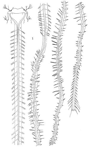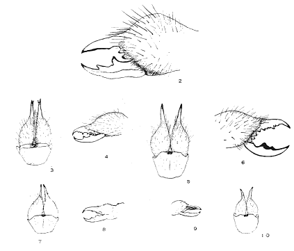 The mandibles are provided with three distinct kinds of hairs or spines. The large subquadrate proximal joint was clothed with long barbed spines, the movable finger having on its median surface a row of fifteen back curved barbed spines. In the space between the movable and stationary finger were long hairs, enlarged in the center and tapering off to a fine point, the tapered portion being barbed. The mandibles are set well down in the sephalothorax.