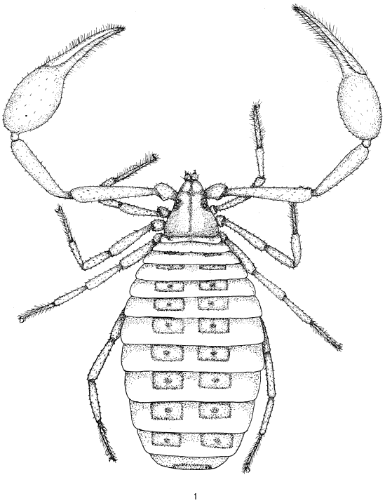 Prof. Dr. Friedrich Dahl places the external sexual organs of this family on the legs and in the Thelyphonidæ which is closely related. They are found in the second joint of the tarsus of the first legs. Careful study failed to find any trace of secondary sexual organs in Trithyreus pentapeltis.
