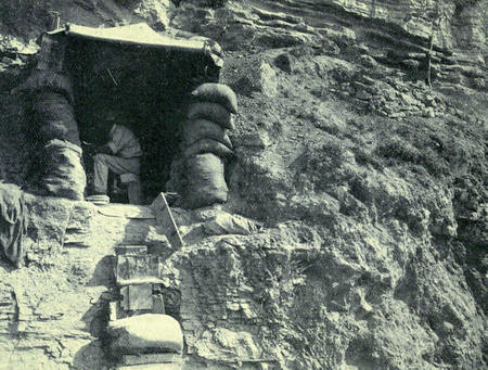 BACK TO PRIMEVAL LIFE. AT THE END OF A TRENCH, SHOWING A FIRE WHICH COOKS AND GIVES WARMTH.