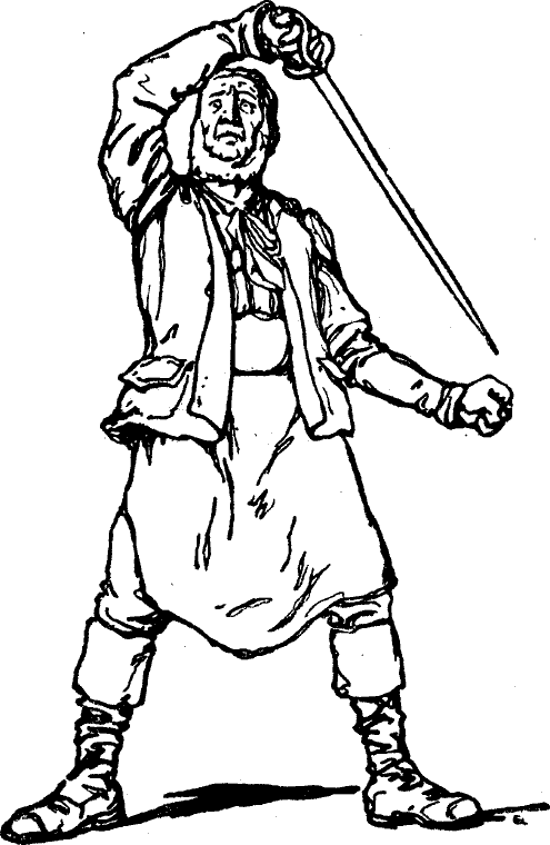 Mit gebeugtem Haupt ging der alte Mann in seine Kammer, und vorsichtig verschloß er hinter sich die Türe. Aus seinem Bettsack wühlte er ein altes, etwas verrostetes Schwert heraus, damit hatte Anno 1758 sein[S. 23] Vater bei Zorndorf unter dem alten Fritz gefochten. Mit finsterer Miene wog der Vogt Erdmann Schwarze das Schwert in der Hand, und dreimal hieb er zu, daß es sausend die Luft durchschnitt, ja er konnte es noch führen. Dann faltete er seine harten Arbeitshände über dem Schwert zusammen und wie ein Schrei brach es aus seiner Brust: »Herr Gott, erbarme dich unserer Not!«