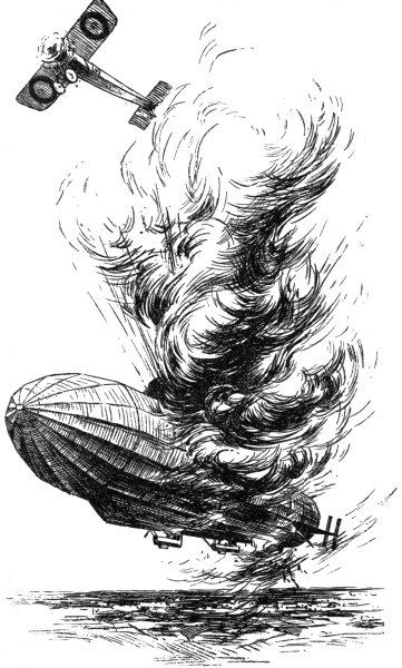 He was one of the British air squadron which went up to chase off the enemy from what they called “the fortress of London.” He flew almost by himself right into the middle of the German squadron, and both he and his observer at once opened fire upon the enemy. The Germans replied and Young’s machine was literally pelted with bullets on all sides.