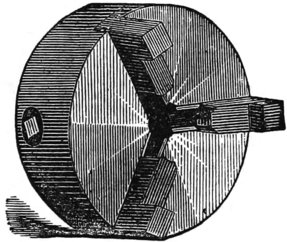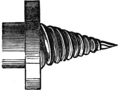 It is not necessary to mention what kinds of work can be done, for that will occur to every one, but I will merely give here an illustration of the facility which the chuck affords for all kinds of work. Fig. 57 is a box cover, and being held at first by the corners, permits the inside to be turned out to fit the bottom. Afterwards, whatever finish or pattern is desired, can be given to the top. There is in every lathe, a center screw, like Fig. 58, which is useful for holding work that has, or is to have, a hole in it, but for fine work it is not suitable, for the obvious reason that the screw spoils it. Fig. 57 is the scroll chuck, and is a favorite instrument of mine. I could dispense with many things—the face-plate of the lathe for one—better than I could with this. If I want to make a sleeve-button, there is my friend, the scroll chuck, ready to hold the piece true to the center, without any adjustment whatever and hold it firmly, too. If I wish to bore out a ring, the chuck will grasp true, and hold it without spring: in fact, not to dilate unnecessarily, I call it the one thing no turner can afford to be without. There are many in the market, but the best one for general work of this class, I have found to be that made by A. F. Cushman, of Hartford, Connecticut. He makes a very small chuck, also, for holding drills, that is exceedingly convenient for them, and for holding screw wire, or any work of that class. The “Beach Chuck,” made by the Morse Twist Drill Company of New Bedford, Massachusetts, is also a good chuck, but as I am not now discussing the merits of chucks, I will return to the subject in hand—treatment of woods.