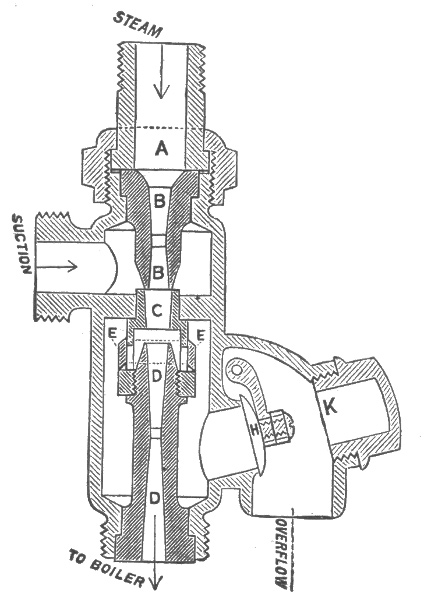 The furnace is a closed receiver, and is fed with coke. Air is pumped into it at a pressure of about 30 lb. to the square inch, part being delivered below the fuel and part above. That part which goes below rises through the incandescent coke, and appears at the surface as carbonic oxide. Here it meets the upper air supply and burns with a fierce bright flame, producing very hot gases, which are admitted to the cylinder and there expand, driving the piston before them. From experiments made by Mr. C. Ingrey with engines of this kind, it appears that they consume from 2¼ lb. to 2½ lb. of coke per brake horse power per hour, and thus provide power very economically.