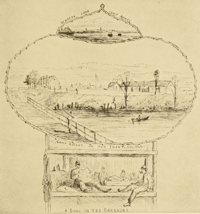 The quartermaster's boat lay at this wharf, for all the light stores were brought from Newbern by water, the heavier ones coming in the cars. The boat was manned by a detailed crew, exempt from all other duty, but as the officers made frequent use of the boat to go to the city at all hours of the day and night, the position was no sinecure. We poor soldiers who were blessed with occasional furloughs to visit the great centre of attraction, were sometimes honored by an humble seat in the bow, for which we were duly grateful, being thereby saved a long and dusty walk.