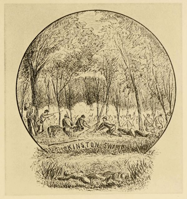 The head of the other column arrived just as our victory was assured, but it was not thought best to penetrate any farther on account of our nearness to Kinston, only six miles distant, and not even to[104] hold what we had gained. So, with a loss of one killed and three or four wounded, we started on the return march for camp, ten miles away. Night soon fell, and, to increase the pleasure of the way, it began to rain, gently at first, but soon with a vigor which was, under the circumstances, anything but agreeable.