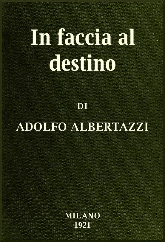The Project Gutenberg EBook of In faccia al destino, by Adolfo Albertazzi This eBook is for the use of anyone anywhere in the United States and most other parts of the world at no cost and with almost no restrictions whatsoever. You may copy it, give it away or re-use it under the terms of the Project Gutenberg License included with this eBook or online at www.gutenberg.org. If you are not located in the United States, you'll have to check the laws of the country where you are located before using this ebook. Title: In faccia al destino Author: Adolfo Albertazzi Release Date: February 25, 2015 [EBook #48361] Language: Italian Character set encoding: UTF-8 *** START OF THIS PROJECT GUTENBERG EBOOK IN FACCIA AL DESTINO *** Produced by Carlo Traverso, Barbara Magni and the Online Distributed Proofreading Team at http://www.pgdp.net (This file was produced from images generously made available by The Internet Archive)