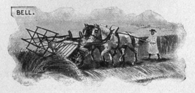 Bell's machine was pushed before the horses, as modern headers are. Its reel was supported by forwardly reaching arms as now; it had dividers and all essential elements, the only faulty one being the cutting apparatus.