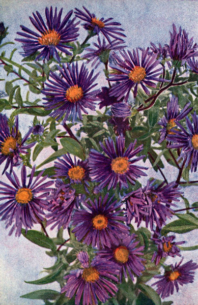 The mythical origin of the Asters is set forth in an old Greek story, which states that after the gods had abandoned the earth, because of the crimes and dissensions that came with the Brazen Age, Astraea, the goddess of innocence and purity, alone remained, endeavoring to redeem the degenerate race of mortals. She, too, finally left, and became known among the stars as the constellation Virgo, or the Virgin. After the wrath of Jupiter had been appeased by the destruction of the earth by water, Virgo, noticing that the summit of Mount Parnassus had alone escaped the flood, planted there a seed, whose flowers should reflect the azure hue of her new home and whose heart should typify the Golden Age that some day will come again to mankind. This plant, Virgo destined as a symbol of her mission of purity and so she gave it her early name, Astraea or Aster. That the plants might bloom for all races of men, Zephyrus, the lover of Flora, queen of the flowers, took the seeds and distributed them throughout the earth from polar snows to the sun-kissed lands of the equator. Hence it is that the Aster, in some of its varied forms, is found in all countries, over two hundred and fifty species being known to botanists. Although the plant is cosmopolitan, it is essentially an American form, one hundred and fifty of the total known species belonging to North America. Of the balance, Russia claims twenty, Europe ten and Canada sixty or seventy.