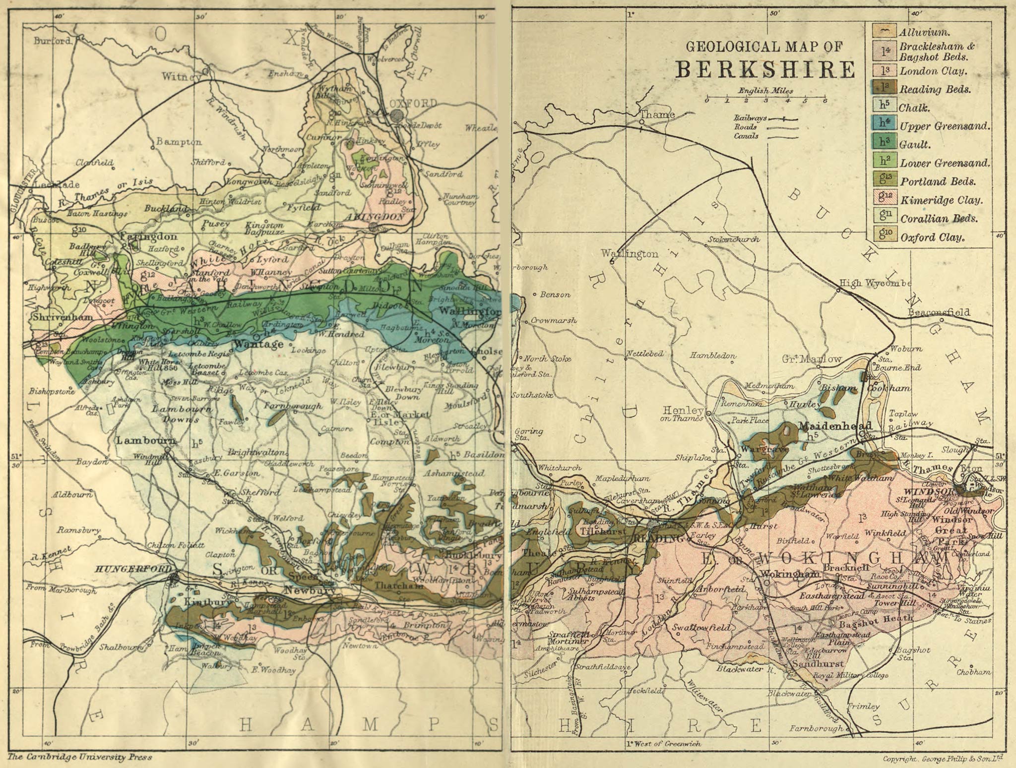 The Thames forms the county boundary at Old Windsor from a point a little above Magna Charta Island and separates Berkshire from Buckinghamshire, and later on from Oxfordshire, the boundary sometimes running in midstream, sometimes on one bank, and sometimes on the other bank. Near Oxford the boundary passes for a short distance a little to the west of the river, that is on the Berks side. The Upper Thames or Isis becomes the boundary between Berkshire and Oxfordshire, and then for a very short distance between Berkshire and Gloucestershire, until near Buscot the river Cole joins the Isis and the boundary turns in a southerly direction near to the bank of the Cole, the adjoining county being then Wiltshire. The county boundary runs by or close to the river Cole to near Bourton, and it then crosses the chalk country with no definite marks. At one point it crosses an old earthwork, Membury Fort, and reaches the river Kennet a little east of Chilton Foliat. From this point to near Woodhay, a distance of some 14 miles, the boundary of the county for administrative purposes differs from the boundary of the ancient or geographical county (see page 9), indeed considerable alterations have been made in this part of the county boundary at various times. The present administrative boundary after crossing the Kennet, turns in a westerly and then in a south-easterly direction following the border of Hungerford and Inkpen parishes and runs on to a point at the south-western [23]corner of Combe parish where Berkshire, Wiltshire, and Hampshire meet. The Berkshire boundary then runs west to Pilot Hill and then turning takes a northerly or north-easterly course until it reaches the stream Emborne which it follows for several miles until near Brimpton the stream bends sharply northwards to join the river Kennet, while the county boundary continues its easterly course through a forest country to the Imp Stone plantation. It then makes a wide detour to the north leaving Mortimer West End and the Roman town of Silchester in Hampshire. This part of the boundary has at more than one date been subject to alteration and for a time it ran close to Silchester and is thus marked on many maps. Stratfield Mortimer is in Berkshire, and about a mile to the east of Silchester the county boundary reaches a Roman road which it follows pretty closely for a considerable distance, [24]crossing the river Loddon at Stamford End Mill. On the east of the Loddon we come to a small tract which, until modern times, was an outlying part of Wiltshire, bounded in part by Berkshire and in part by Hampshire. It is now included in the former county, and the Berkshire boundary continues its easterly direction on or near the Roman road until it reaches the stream Whitewater close to its junction with the Blackwater. The county boundary reaches the latter river close to a ford, no doubt a well-known place, for these fords are in most cases very old crossing-places and this one certainly goes back to Roman times and may very likely have been used in still earlier days. The boundary then turns along the Blackwater, and though it does not always follow the present course of the stream, it keeps near to it [25]for some eight miles, until we reach the Blackwater Bridge on the London and Southampton Road. This is another ancient crossing-place, and here the counties of Berkshire, Hampshire, and Surrey meet. The Berkshire and Surrey boundary now runs in a north-easterly direction, through the grounds of the Royal Military College, Sandhurst, up a small stream to a place named Wishmoor Cross, possibly the site of a cross in former days, and evidently a well-known place, for five parishes meet there. From this point the boundary crosses the forest district of Bagshot Heath, celebrated in connection with highwaymen, and eventually reaches the Thames near Old Windsor.
