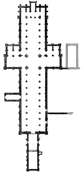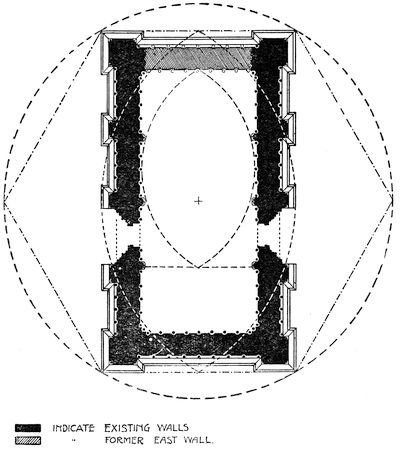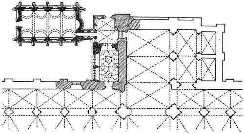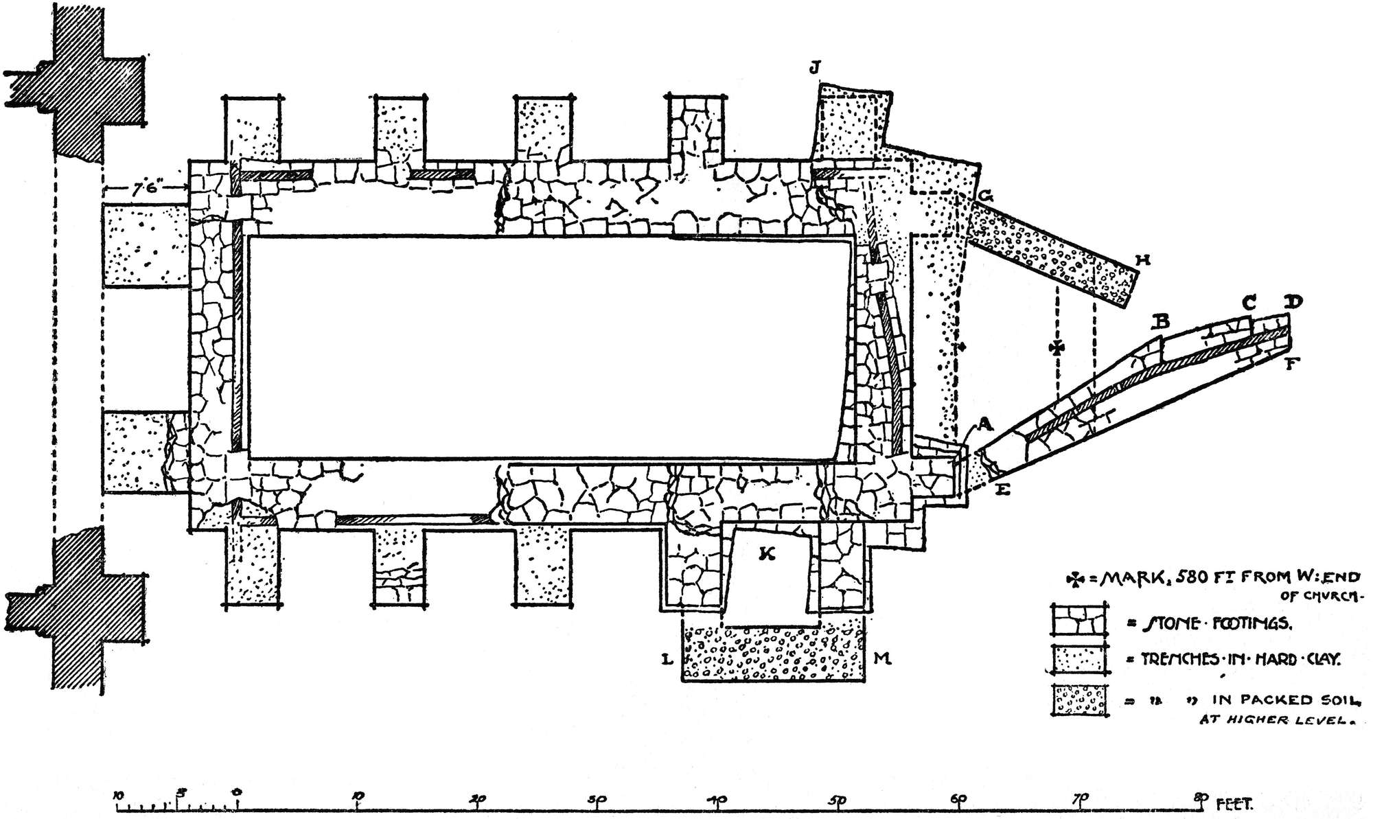 21 The wall of the vestry was subsequently dug for and found outside the bay of the south quire wall third from the west, where there were indications of such an appendage in the grooving of the masonry for the flashings of a lead roof, and the plinth mould had been shorn off to get rid of an inconvenient projection. The trench showed a thin wall giving a vestry about 9 feet wide.