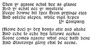 Two problems in the script have engaged the serious attention of critics. The first and simpler of the two is that which is involved in the language and literary form of the messages. This is a curious patchwork of Low Latin, Middle English of mixed periods, and Modern English of varied style and diction. It is a mosaic of multi-coloured fragments cemented together in a strangely random fashion. This anomaly is the more remarkable from the contrast it presents to the sustained and consistent burden of the script itself, which, as though in obedience to some preordained intention and settled plan, seems to proceed to the presentment, line by line, of a completed whole, with absolute patience and indifference to interruptions. Lapse of time seems of no account. After a break of several hours, the thread is resumed at the point where it had been dropped. The unfinished communications about the Loretto Chapel in 1911 are picked up and spontaneously completed five years later. Nevertheless, the queer patchwork of language is again evident.
