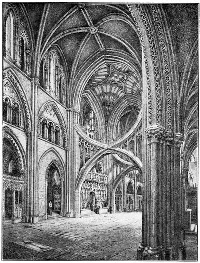 That the building in the angle of the nave and transept was formed with the double object of a support to the weak walls of the crossing, and as a covered approach to the Chapel of the Loretto, erected by Abbot Bere on a site adjoining the north side of the nave, but not attached directly to same, and that this cloister was built in the later English style in which his own masons were expert. |