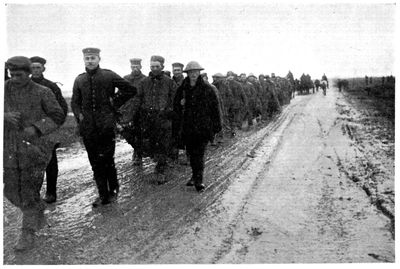 Here again there has been a famous haul of prisoners. More than 300 unwounded soldiers have been compelled to surrender. In a short time the first of them cross in front of our observation post. They are haggard, covered with mud, and their eyes are the eyes of trapped beasts. Two of them, converted into impromptu stretcher-bearers, are carrying a wounded officer on a stretcher that is soaked in blood.