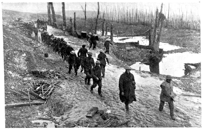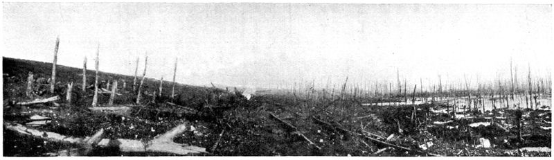 Swamps, soggy undulations formed by the trenches and the convoys, a wet, clayey soil, into which one sinks to the waist. Mud everywhere. Slime everywhere. One must slide down the funnels and holes that the shells have made. Thus the waves of the assault gather for their onset. The Germans had constructed defences formed of five lines of trenches, each alternated with at least three rows of barbed wire entanglements. The chevaux de frise and other obstacles covered, in places, a space over 200 yards wide.