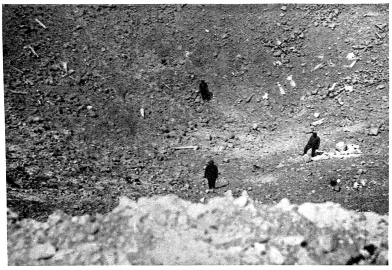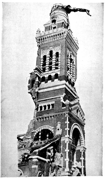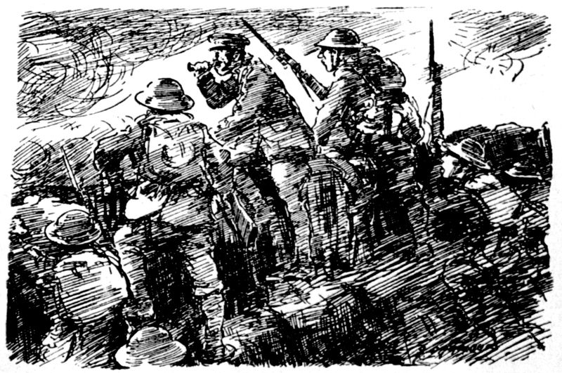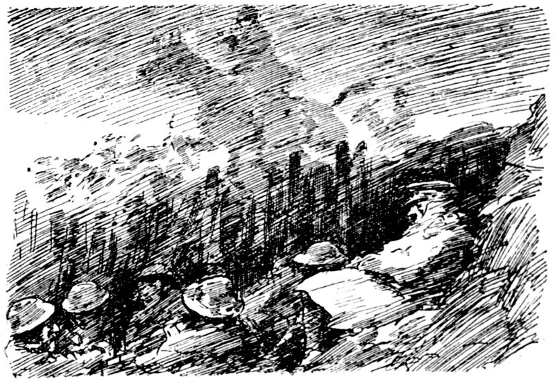 A few hundred yards ahead of us the men have just rushed forward. With rifles held high they spring from the parapet into the open. They look like an army of ants, that now moves along in a stream, now closes together like a vice, now marks time, now plunges into vast funnels, and again, at racing speed, surges up the gentle slope. The barbed-wire entanglements cover acres of ground; they are the eleventh line of the German defences. In many places the wires are so closely bunched together that the balls cannot pass through them.