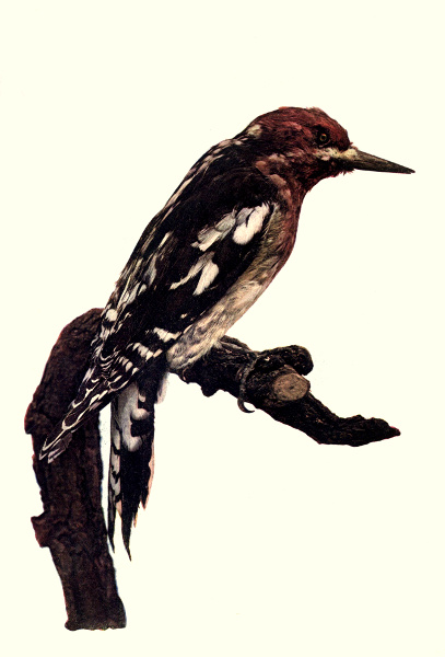 A sister species of the Sapsucker of our illustration is the beautiful Williamson's Sapsucker (Sphyrapicus thyroideus), an inhabitant of the Pacific coast. This bird differs from all of the woodpeckers in that the two sexes show a great difference in coloration. So marked is this difference that for a long time they were described as distinct species.