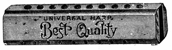 | The Clover Harmoniphone is an entirely new and novel invention, combining one of the famous Clover Harmonicas with a metal Phone. The Phone adds greatly to the richness and purity of tone and increases the volume many times over. Acting like a horn on a phonograph it takes up every note whether faint or loud and sends them forth with wonderful effect. One Phone will last a lifetime as it is fitted with flanges from which the mouth organ can be detached or replaced at will. Each Harmoniphone is packed in wooden box complete with instruction book. Per doz. | $9 60 | |