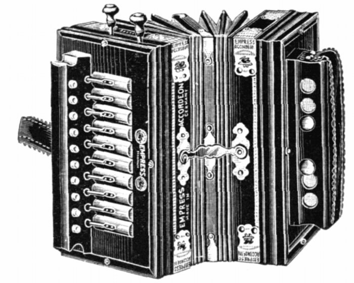 | 58. | Nickel shell, wood lined, wire edge, birch neck, ebony pegs, grooved hoop, metal tail-piece; 13 hexagon brackets, all parts finely nickel plated | 12 00 |