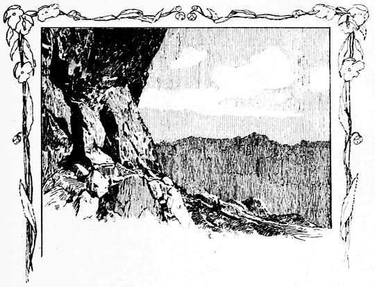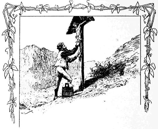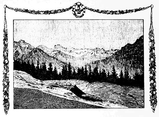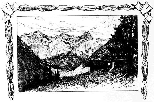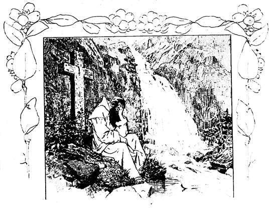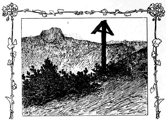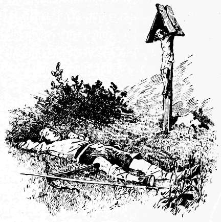 Als er die Höhe betrat, winkte ihm, scharf abgehoben vom rotglühenden Abendhimmel, ein mächtiges Kreuz entgegen; ein Dächlein war darüber gespannt, in den Querhölzern staken die Nägel, aber das Bild des gekreuzigten Erlösers fehlte; die frommen Almbauern hatten es im Herbste vom Kreuz genommen, damit es nicht leiden möchte von der Unbill des Winters, von Schneedruck und Lawinen.