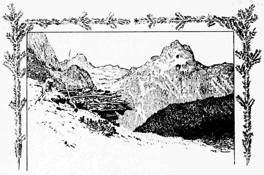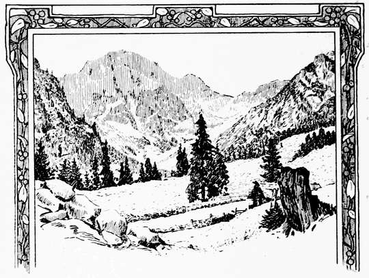 Haymo konnte den See nicht gewahren, auch nicht das weite Klosterland im Tal. Die tiefer liegenden Bergrücken wehrten seinem Auge den Niederblick. Aber ringsumher in weiter Runde bot sich ihm ein Bild von wundervoller Schönheit. Übergossen von der roten Glut der sinkenden Sonne, ragten die gewaltigen Schneeberge empor über das dunkle Meer der Wälder: dem Jäger zur Linken die wilden Tauern, die beiden Riesenzacken des Wazmann und die Schrofen der Wazmann-Kinder, zur Rechten der stolze, unwegsame Göhl, und in der Ferne, von bläulichem Schattenduft umwoben, stiegen die scharfgezahnten Lattenwände und die plumpen Massen des Untersberges in den golddurchleuchteten Abendhimmel. Wenn auch der Föhn mit Brausen alle Lüfte füllte, so trübte doch kein Wölklein den frühlingsklaren Himmel; um die Zinnen der Berge flatterte keine Nebelflocke, und ohne Dunst und Schleier lag das tiefere Geländ.