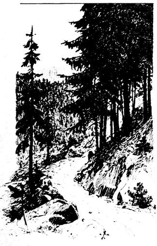 „Frieren?“ lachte sie. „Das Heu macht warm!“ Und da sie sich schon zum Gehen wenden wollte, nahm sie rasch ein paar Schneerosen aus dem Körbchen und schob sie zwischen die beiden eisernen Nägel, die im Fußbalken des Kreuzes staken. Einen stummen Gruß nickte sie dem Jäger noch zu, dann fing sie mit der Hand das flatternde Haar, wand es um den Hals und huschte davon. Ein paar Schritte nur, und sie war in die Senkung des Tales hinuntergetaucht.