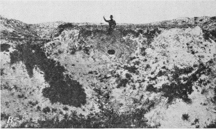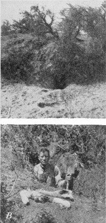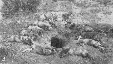 The digging necessary to capture pups depends largely on the nature of the soil and the location of the den (fig. 2, B). Some dens are so shallow that little digging is required; others cannot be dug out; and some burrows lead straight into a bank or under a hardpan ledge. Much work can be avoided by running a shovel handle or long stick as far as possible into the hole to ascertain its direction and then digging a pit down to the den instead of following the burrow. Where digging is extremely difficult, the animals may be disturbed and induced to move, frequently to a den from which they can be more readily taken. Usually they move from a quarter of a mile to a mile away and can easily be tracked. If pups can be seen back in a den but cannot be reached in digging, a forked stick or a wire so twisted as to catch in their fur has been employed to save labor; but if the den or burrow branches and turns, such an instrument is never wholly satisfactory, as some of the whelps are likely to be missed.
