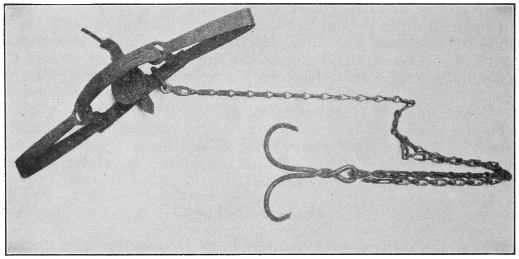 Figure 1.—Trap most suitable for mountain-lions (No. 4½), showing drag chain and double-pronged drag attached