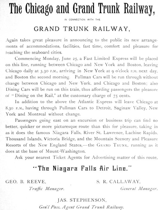 Passengers going east on an excursion or business trip can find no better, quicker or more picturesque route than this for pleasure, taking in as it does the famous Niagara Falls, River St. Lawrence, Lachine Rapids, Thousand Islands, Victoria Bridge, and the Mountain Scenery and Pleasure Resorts of the New England States,—the Grand Trunk, running as it does at the base of Mount Washington.