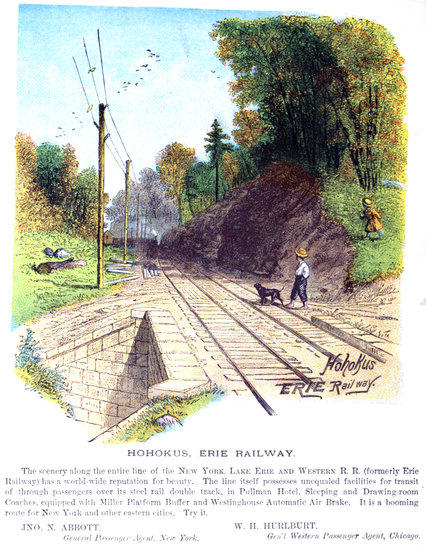 The scenery along the entire line of the New York, Lake Erie and Western R.R. (formerly Erie Railway) has a world-wide reputation for beauty. The line itself possesses unequaled facilities for transit of through passengers over its steel rail double track, in Pullman Hotel, Sleeping and Drawing-room Coaches, equipped with Miller Platform Buffer and Westinghouse Automatic Air Brake. It is a booming route for New York and other eastern cities. Try it.
