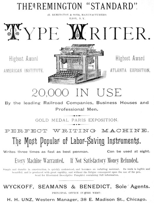 Simple and durable in construction, is quickly understood, and becomes an unfailing assistant. Its work is legible and beautiful, and is produced with great rapidity, and without the fatigue consequent upon the use of the pen. Send for Illustrated Descriptive Pamphlet containing full information.