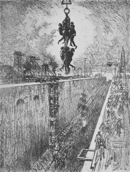 Next day I started across the Continent to Panama, for I learned the Government headquarters were there, and, until I had seen the officials, I did not know if I should be allowed to work or even stay on the Isthmus. But at Gatun I got off the train, determining to do all I could before I was stopped—as I was quite sure I should be. I saw the tops of the locks only a few hundred yards away, and, turning my back on the stunning town piled up on the hillside, walked over to them; from a bridge bearing a sign that all who used it did so at their own risk I looked down into a yawning gulf stretching to right and left, the bottom filled with crowds of tiny men and tiny trains—all in a maze of work; to the right the gulf reached to a lake, to the left to mighty gates which mounted from the bottom to my feet. Overhead, huge iron buckets flew to and fro, great cranes raised or lowered huge masses of material. As I looked, a bell rang, the men dropped their tools, and lines of little figures marched away, or climbed wooden stairs and iron ladders to the surface. The engines whistled, the buckets paused, everything stopped instantly, save that from the depths a long chain came quickly up, and clinging to the end of it, as Cellini would have grouped them, were a dozen men—a living design—the most decorative motive I have ever seen in the Wonder of Work. I could not have imagined it, and in all the time I was on the Isthmus I never saw it but once again. For a second only they were posed, and then the huge crane swung the group to ground and the design fell to pieces as they dropped off.