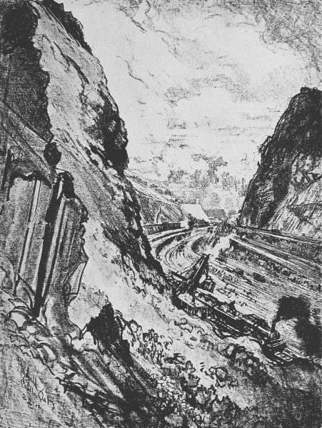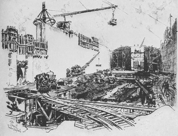 THERE is a safety gate in each lock, to protect, in case of accident, the main lock gate, just suggested, with the figures working at the armor-plate facing, on the extreme right. Beyond are the outer walls and approaches of the upper lock, and beyond these, but unseen, the lake. At the bottom is the railroad and the temporary opening shown in the previous drawing. The scale, the immensity of the whole may be judged by the size of the engines and figures. I have never seen such a magnificent arrangement of line, light and mass, and yet those were the last things the engineers thought of. But great work is great art, and always was and will be. This is the Wonder of Work.