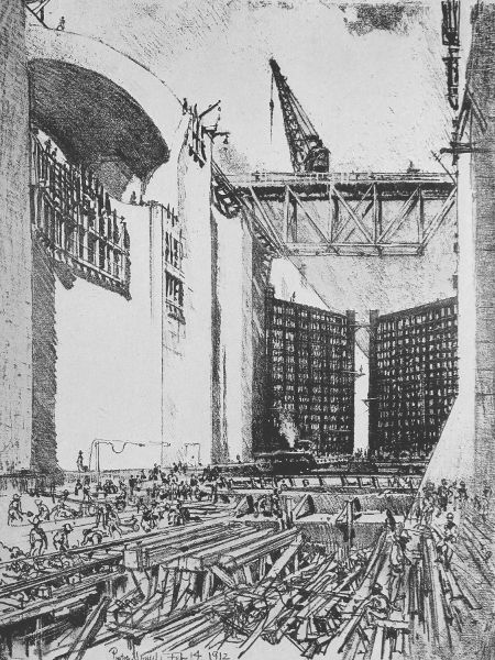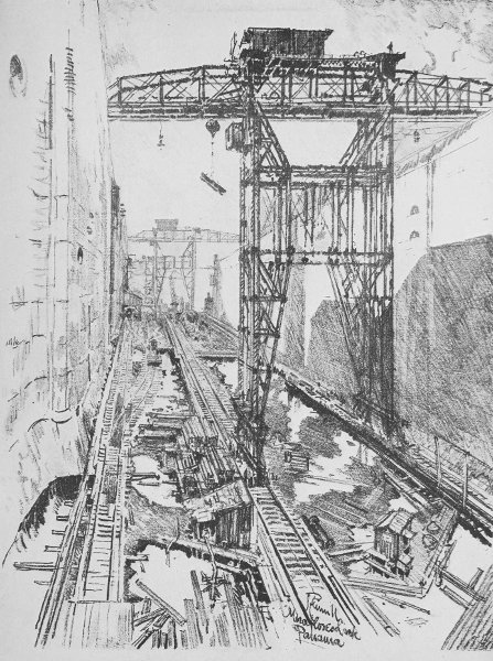 I did not bother myself about these things, nor about lengths and breadths and heights and depths. I went to see and draw the Canal, and during all the time I was there I was afforded every facility for seeing the construction of the Panama Canal, and from my point of view it is the most wonderful thing in the world; and I have tried to express this in my drawings at the moment before it was opened, for when it is opened, and the water turned in, half the amazing masses of masonry will be beneath the waters on one side and filled in with earth on the other, and the picturesqueness will have vanished. The Culebra Cut will be finer, and from great steamers passing through the gorge, worth going 15,000 miles, as I have done, to see. But I saw it at the right time, and have tried to show what I saw. And it is American—the work of my countrymen.