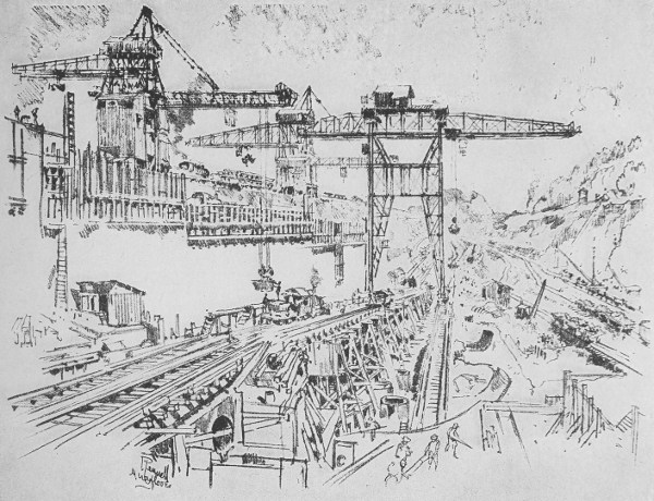 THIS was drawn from the opposite end of the lock and the great side walls topped with their concrete-making crenellations and cranes are seen. In the foreground, on the left, is one of the side openings for emptying the water from one lock to another—for all the locks are double, side by side, and ships will not have to wait until a lock is empty, as is usual, before they can enter, but, as one empties, the same water partly fills the one beside it, and so steamers will pass without waiting. Two or three small vessels can go through at the same time, as well as the largest with room to spare.