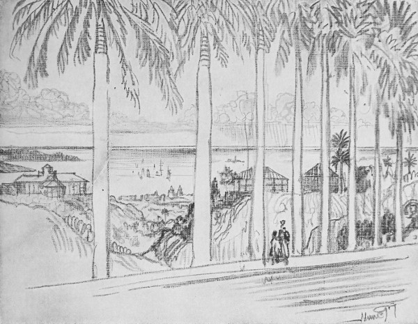 THIS drawing was made from the channel which leads out to the Pacific Ocean. The mouth of the Canal is on the left in the flat space between the mountains; on the right of this, the dark mass on the edge of the water is the docks and harbors; then comes the great, towering Ancon Hill, one side all dug out in terraces for dirt, much of which goes to fill in the outside of locks, which, however, will work before they are filled in. And for what other purposes the War Department are going to use this Gibraltar they alone know. The other side, a mass of palms shelters the houses of the officials, and at the foot of the hill, to the right, Panama—as beautiful as Naples or Tangier, yet hardly a tourist knows it; and—well, the Government is not running a tourist agency.
