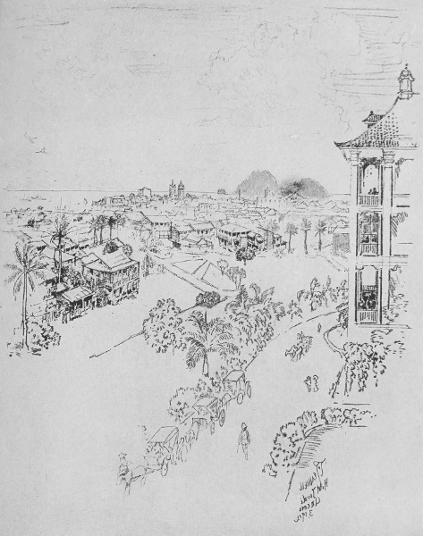 Across the bridge was a telephone station and beyond and below it the great approaches to the locks along which electric locomotives will draw the ships that pass through. There was a subject, and I tackled it at once. In the distance the already filling lake—among islands, but the highland still above the water, dotting it, crowned with palms and strange trees; dredgers slowly moved, native [Pg 9] canoes paddled rapidly, over all hovered great birds. To the right was the long line of the French Canal, almost submerged, stretching to the distance, against which, blue and misty and flat, were strange-shaped mountains, outlined with strange-shaped trees. Bridges like those of Hiroshigi connected island with island or with the mainland. It was perfect, the apotheosis of the Wonder of Work, and as I looked the whole rocked as with an earthquake—and then another. I was dragged into the hut as showers of stones rattled on the roof as blast after blast went off near by. Soon people in authority came up—I supposed to stop me; instead it was only to show pleasure that I found their work worth drawing. These men were all Americans, all so proud of their part in the Canal, and so strong and healthy—most of them trained and educated, I knew as soon as they opened their mouths—the greatest contrast to the crowd on the steamer, who now were all tamely following a guide and listening to what they could neither understand nor see during their only day ashore. These engineers and workmen are the sort of Americans worth knowing, and yet I did not see any golf links at Gatun. The day was spent in that telephone box and on the Spillway of the Dam—a semicircle of cyclopean concrete, backed by a bridge finer than Hokusai ever imagined, yet built to carry the huge engines that drag the long trains of dirt and rock across it, to make the dam. The dam, to me, was too big and too vague to draw. And all this is the work of my countrymen, and they are so proud of their work. Yet the men who have done this great work will tell you that we owe much to the French, and that if the engineers and the Commission at Panama had not the Government, with unlimited men and money, behind them, and the discoveries in sanitary science of which the French were ignorant, we, too, would have failed. They tell you, and show you how, the French worked on the Canal right across the Isthmus, and we are carrying out the great project they were unable to complete. And we have won the admiration of the world.