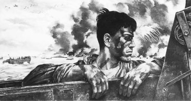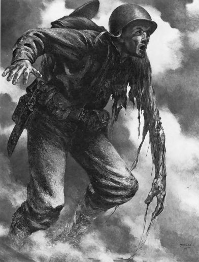 “The Price Lying there in terror looking longingly up the slope to better cover, I saw a wounded man near me, staggering in the direction of the LVTs. His face was half bloody pulp and the mangled shreds of what was left of an arm hung down like a stick, as he bent over in his stumbling, shock-crazy walk. The half of his face that was still human had the most terrifying look of abject patience I have ever seen. He fell behind me, in a red puddle on the white sand.”
