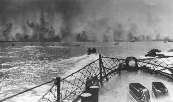 The skies over the landing beaches of Peleliu are blackened with smoke rising from the ground as the result of the combined naval and aerial prelanding bombardment, as amphibian tractors rush shoreward carrying the assault waves.