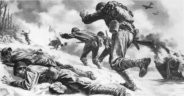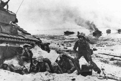 “The Beach ... My First View as I Came Around From the Ramp of our LVT We ground to a stop, after a thousand years, on the coarse coral.... And we ran down the ramp and came around the end of the LVT, splashing ankle-deep up the surf to the white beach. Suddenly I was completely alone. Each man drew into himself when he ran down that ramp, into that flame. Those Marines flattened in the sand on that beach were dark and huddled like wet rats in death as I threw my body down among them.”